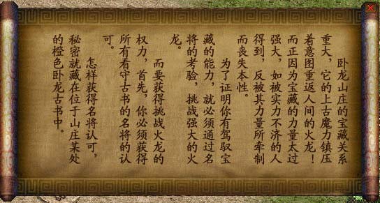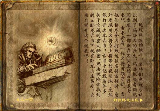 分别到以下五本古书旁边,按照顺序点击古书,并认真阅读古书内容。在看完最后一本古书后,会获得一把开启神秘宝藏的钥匙。获得“宝藏钥匙”后,来到卧龙酒馆门前,找到神秘宝藏,点击开启神秘宝藏即可。