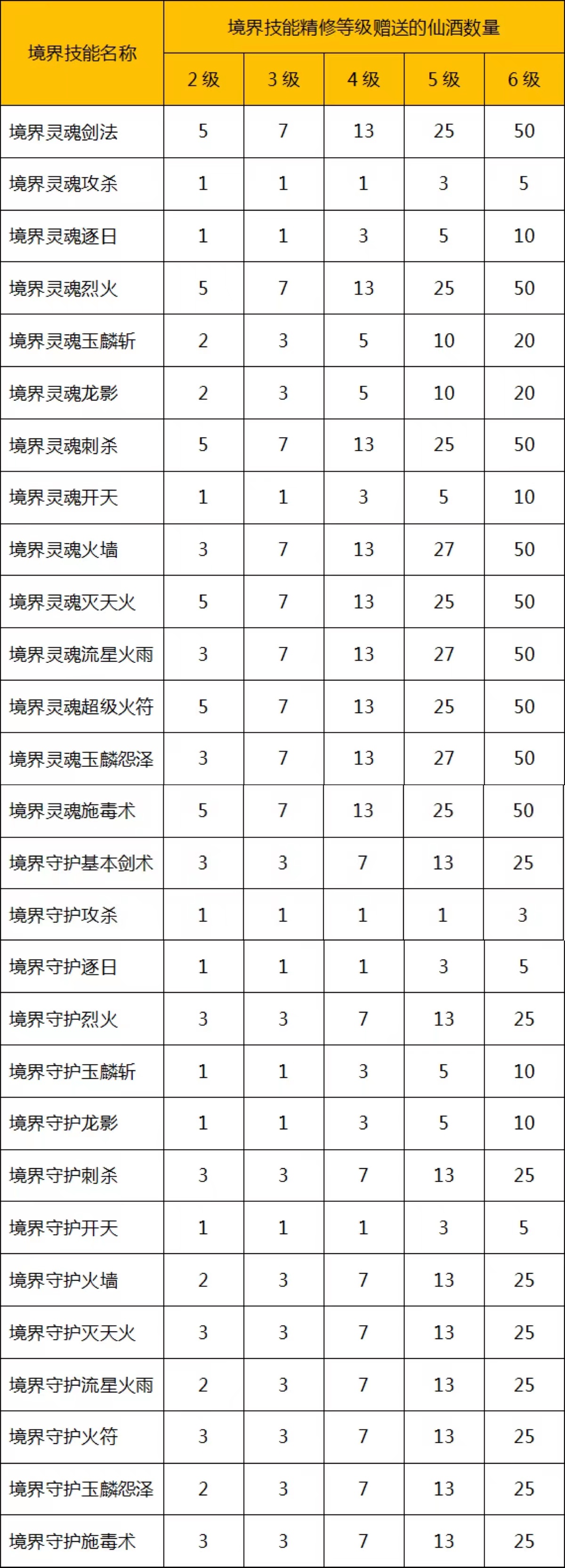 2.人物或英雄境界技能精修等级达到或超过境界技能等级,则可以免费领取一定数量的仙酒。